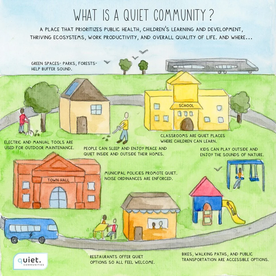 We promote quiet as a valuable natural resource and work to reduce harmful noise and related pollution.